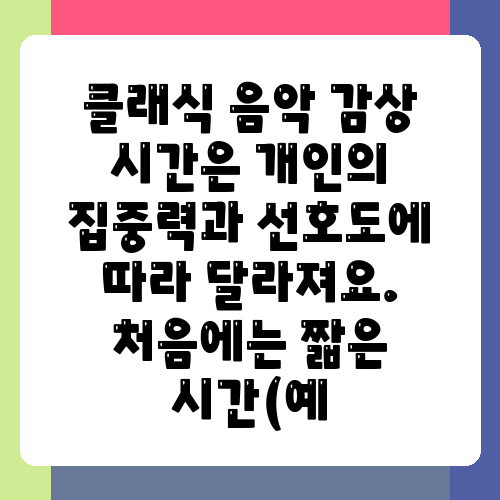 클래식 음악 감상 시간은 개인의 집중력과 선호도에 따라 달라져요. 처음에는 짧은 시간(예
