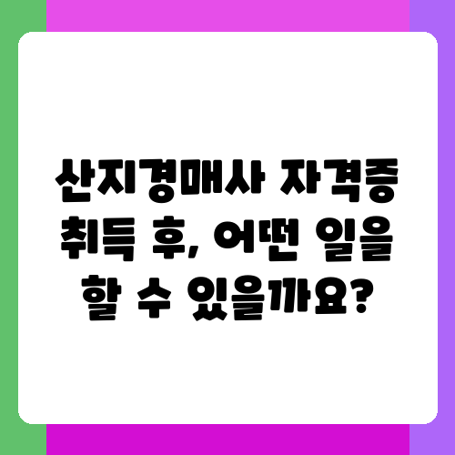 산지경매사 자격증을 취득하면 다양한 분야에서 활동할 수 있습니다. 산림청이나 지자체 등 공공기관에서 산림 자원 관리 및 경매 업무를 담당하거나, 민간 기업에서 산림 자산 투자 및 개발 관련 업무를 수행할 수도 있습니다. 또한, 개인적으로 산림 경매 사업을 운영할 수도 있고요. 산림 자산의 가치가 높아짐에 따라 산지경매사의 수요는 계속 증가할 것으로 예상되므로, 전망이 밝은 직업이라고 할 수 있습니다. 자신의 역량을 키우고 끊임없이 노력한다면, 산림 자산 분야에서 전문가로서 성공적인 커리어를 쌓을 수 있을 거예요. 지금 바로 도전하세요!
